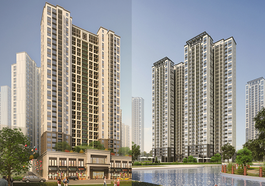 小區(qū)規(guī)劃高層住宅19棟(1號樓T9號樓),除19號樓為28層,6、7、10、11號樓為30 層,3號樓為31層,其余均為32層住宅建筑;幼兒園1棟三層,2層的沿街商鋪設(shè)置在街道路一側(cè),朝向多為南向,朝向優(yōu)越。